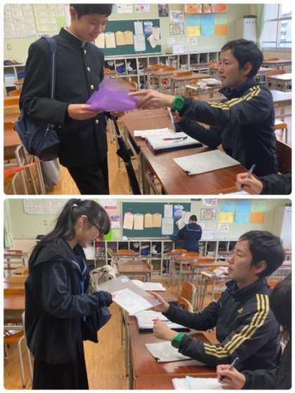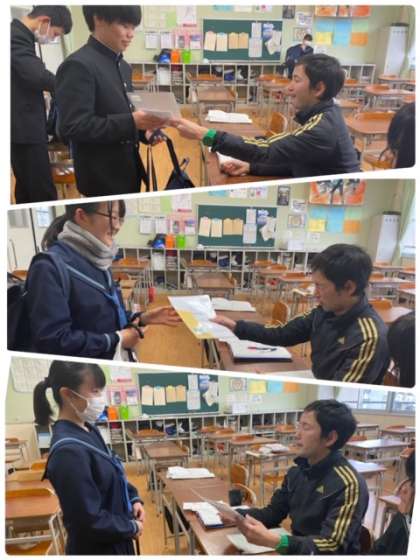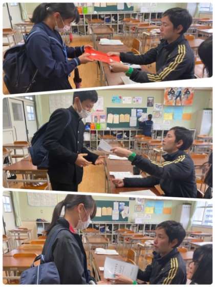 学年の先生から、持ち物や面接時間の確認をしてもらっています。「いい番号や!」と言われて、はにかむ生徒たちがたくさんいます。