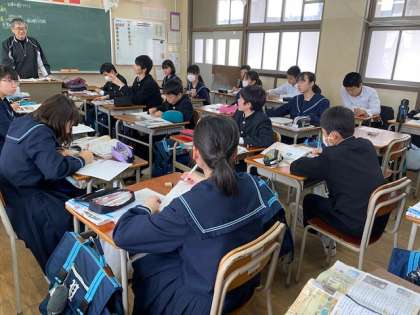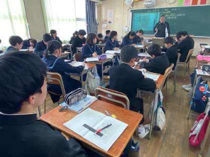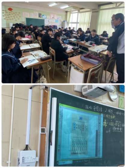 本校の普通教室には壁付けプロジェクタがすべて設置されています。資料を提示したり、学習内容を補足したり、動画を再生したりして様々な活用方法をしています。生徒たちの学びが深まるよう工夫して取り組んでいます。