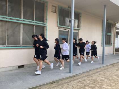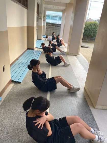 女子バスケットボール部は、体育館の割り当てがないため、中庭で基礎練習を行っています。