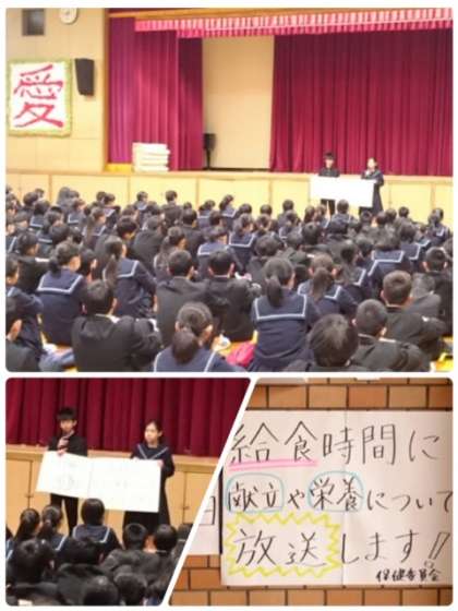 24日から30日まで「全国学校給食週間」です。今日から定期的に、保健委員会から献立や栄養素についての放送を行います。全校集会で保健委員が全校生徒に告知を行いました。