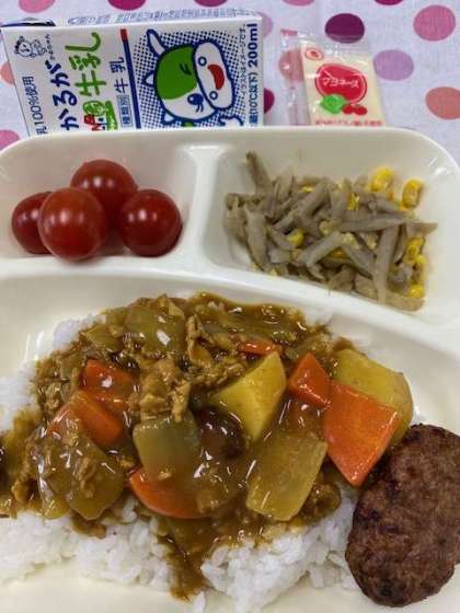 豚肉と金時豆のカレーライス、焼きミニハンバーグ、ごぼうサラダ、プチトマト、牛乳です。