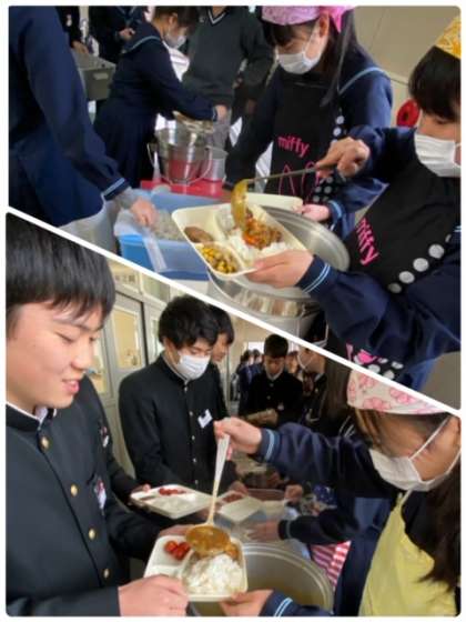 大人気のカレーを、ひとりずついい塩梅で取り分けています。カレーのいい香りが食欲をそそります。