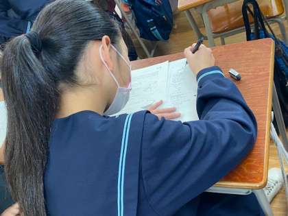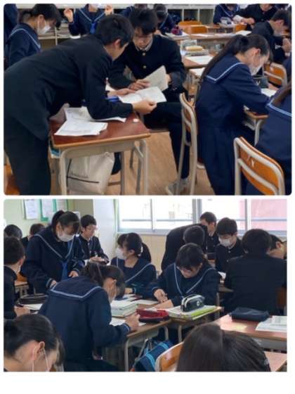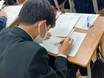 コの字型で、演習問題に取り組み、自然と生徒同士の教え合いがみられます。教えてもらう生徒は理解でき、教えている生徒はアウトプットすることで理解が深まります。
