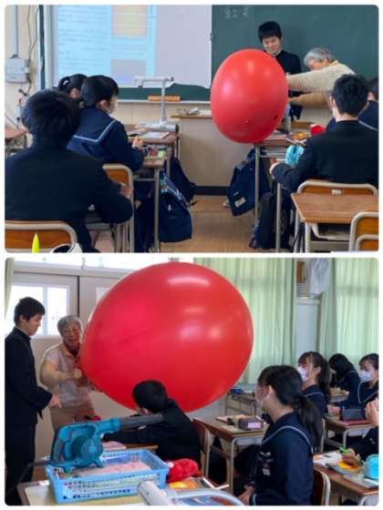 太陽を模型したバルーンを膨らませて、黒点が移動する様子を観察しています。大きく膨らむバルーンに驚きを見せながら、楽しく学んでいます。
