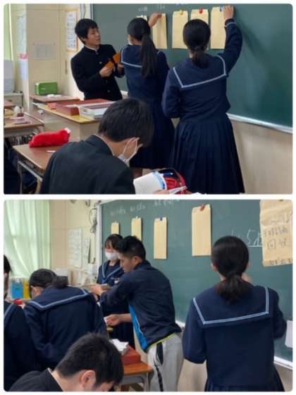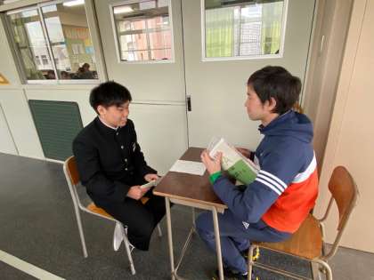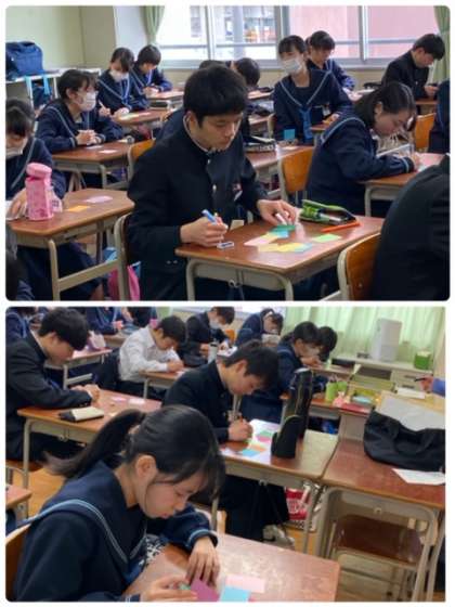 色紙にクラスメイトのいいところを書き込んで、本人宛の封筒に入れていきます。卒業したら、みんなそれぞれの進路を歩んでいくため、みんなからのメッセージは宝物になりますね。また、廊下で進路相談をしているクラスもありました。自分の進路について、よく考えています。