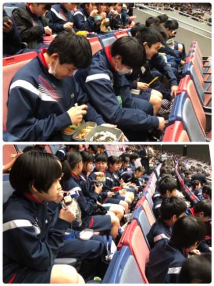 試合観戦しながら、お弁当を食べています。試合後は、車いす体験を行います。