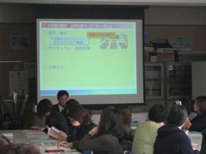 3年学年主任・喜田先生から学年の近況報告をした後、進路指導主事の原田先生から高校入試制度の仕組み、今後の進路にかかわるスケジュールについて説明し、進路決定に向けてのアドバイス等をさせていただきました。