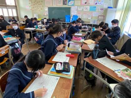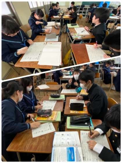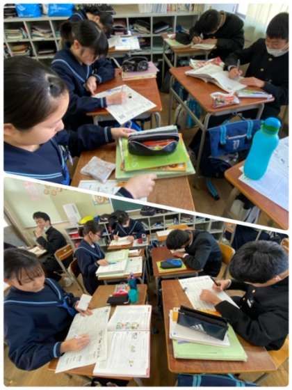 演習問題をグループになって取り組んでいます。先生が机間指導で、つまずいている生徒ややる気のない生徒、がんばっている生徒に声掛けしています。今週の水曜日から学年末テストです。しっかり勉強して臨みましょう。
