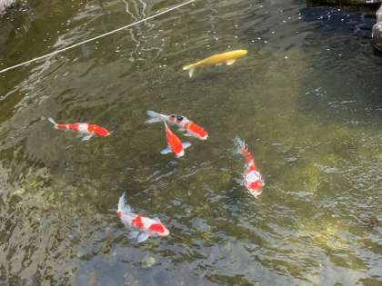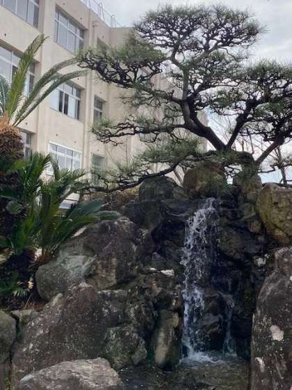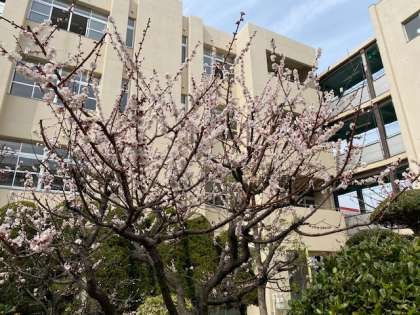 本校自慢の趣ある中庭には、3種類の梅の花が満開となりました。錦鯉や滝も美しく保たれていて、癒しの空間となっています。