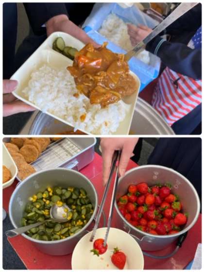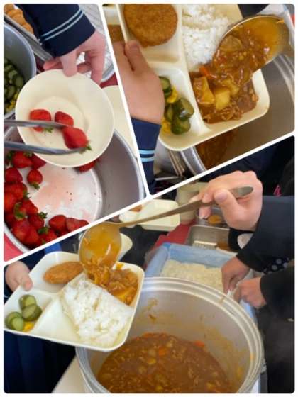 今日の給食メニューは、ポークカレーライス、チキンレバーカツ、きゅうりとコーンのサラダ、いちご、牛乳です。