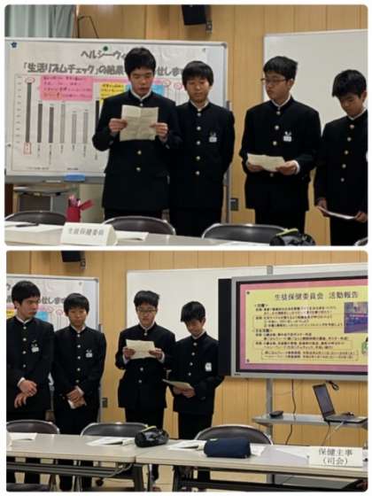 学校医、PTA保健委員長、養護教諭、教職員などが参加して本校の保健状況について話し合いました。また、保健委員会の代表生徒は「朝ごはんウィーク」や「ヘルシーウィーク」の結果を発表してくれました。