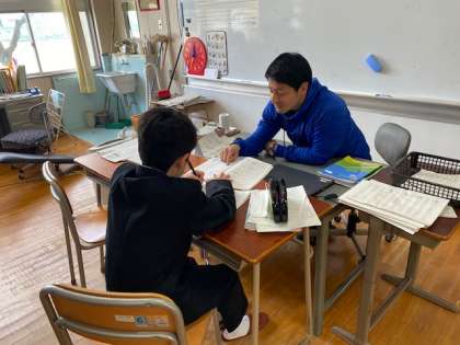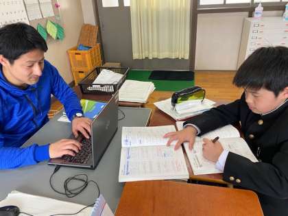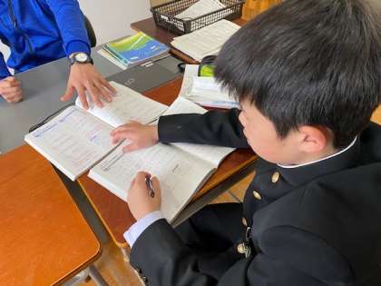学年末テストの提出物について、ワークブックの問題を解いています。きめ細やかな個に応じた指導を行っています。