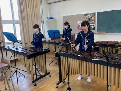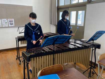 音楽部がマリンバ演奏の練習を行っています。終学活・清掃が終わった生徒から順番に集まってきて、演奏しています。どんどん人数が増えてきて、癒される音色が響いています。