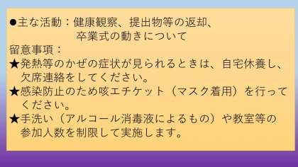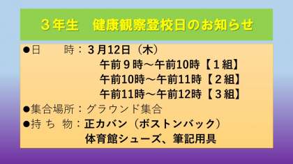 3年生のみなさんは、3月12日(木)に健康観察登校日を実施します。クラスによって集合時間・活動時間が異なるので、注意してください。