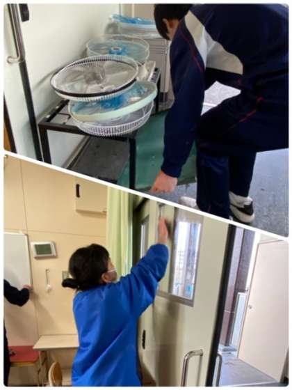 そこで、担任の先生の声掛けに数名の有志達が教室清掃をしてくれています。濡らした新聞紙で窓ふきしたり、傘立てや扇風機を洗ったりしています。ボランティア活動ありがとう!