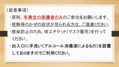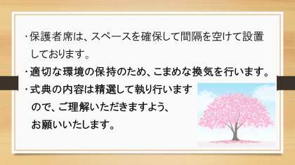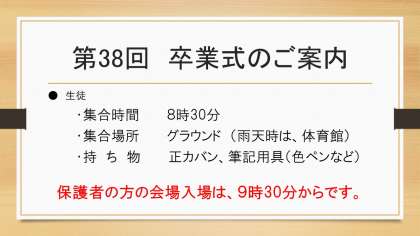 明日は、第38回卒業式を行います。以前、お知らせいたしましたとおりですが、改めてご確認くださいますよう、お願いいたします。