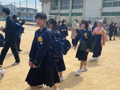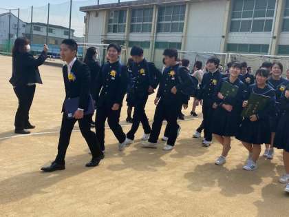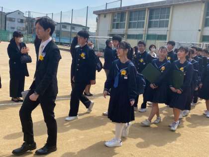 無事に卒業式を終え、保護者のみなさまに作っていただいた花道を卒業生たちが歩んでいます。清々しい表情の生徒たちが見られます。