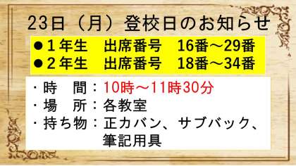 23日は、1・2年生の登校日を行います。