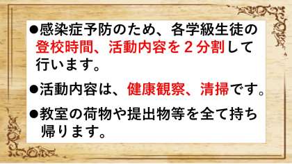 新型コロナウイルス感染症予防のため、各学級の生徒の登校時間、活動内容を2分割して行います。出席番号順により、異なりますので確認してください。