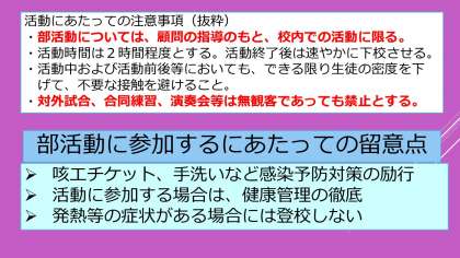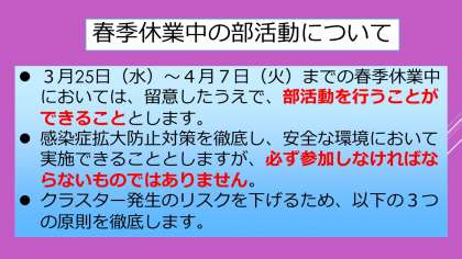 明日から4月7日まで、春季休業となりました。部活動については、さまざまな配慮のうえ活動を再開することとなりましたのでお知らせいたします。