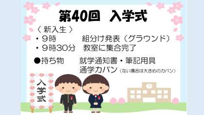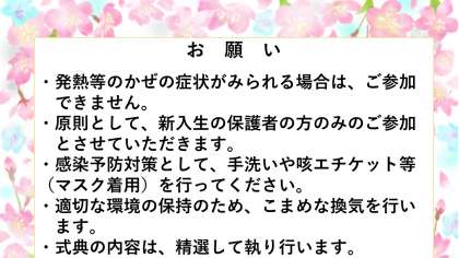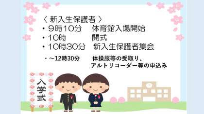 明日の入学式について、お知らせいたします。開式時間は、予定通り10時から執り行います。つきましては、感染症予防を徹底していただきますよう、お願いいたします。