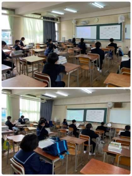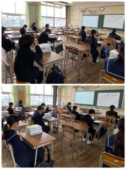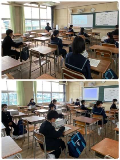 感染症防止のため、クラスを2つの教室に分けています。充分な間隔と換気、消毒、マスクなどの対策をして待機しています。新しい中学校生活に胸を膨らませているようです。