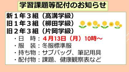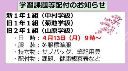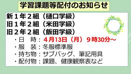 「緊急事態宣言」を受けた対応について、学習課題・健康観察表等を配付する日を設定させていただきます。クラスごとに時間・場所を分けた分散登校とさせていただきますので、よろしくお願いいたします。