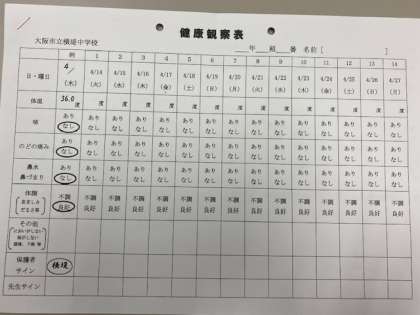 少人数で配付物の確認をしています。特に「健康観察表」の記録について、既に毎朝検温しているところですが、改めてこちらに記入していただくようお願いしています。