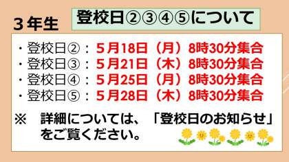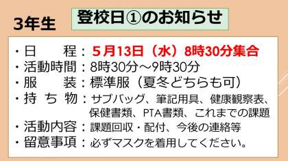 詳細については、配付プリント「3年生 臨時休業期間中の登校日のお知らせ」をご覧ください。