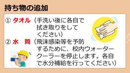 明日の登校日について、持ち物の追加をお願いします。