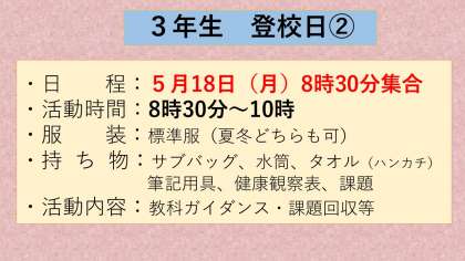 本日は、3年生の登校日です。感染症予防のため、学級を2分割(出席番号順)して1教室の人数を減らして実施します。