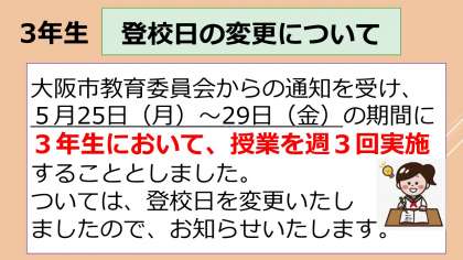 大阪市教育委員会からの通知を受けて、3年生の登校日を変更いたします。