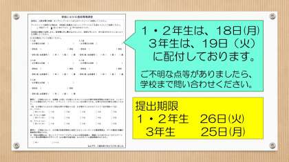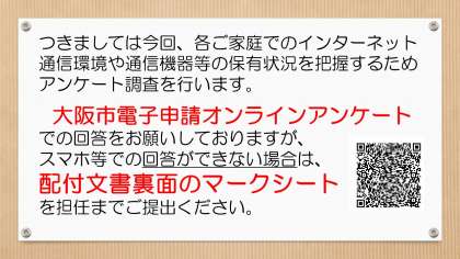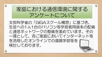 今週の月曜・火曜の各学年登校日に配付しました「家庭における通信環境に関するアンケート」について、改めてご連絡します。