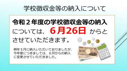 例年5月に納入いただいておりました学校徴収金につきまして、令和2年度は6月26日からと変更させていただきました。よろしくお願いいたします。