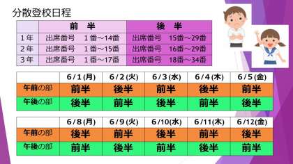 6月1日からは学校が再開されます。12日(金)までは分散登校となりますので、先日配付しました文書「6月1日から学校再開及び分散登校のお知らせ」を参照ください。