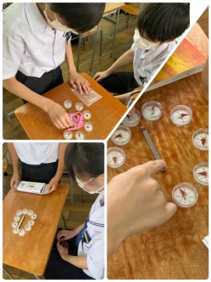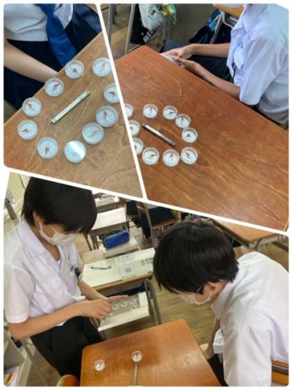 N極とS極の磁界がどのように変わっているかを、方位磁石を使って実験しています。感染症対策をしつつ、平常の授業を行うようにしています。