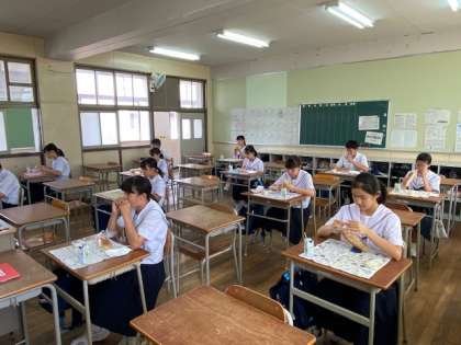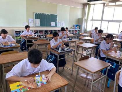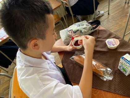 今日のメニューは黒糖コッペパンと牛乳、ぶどうゼリーです。デザートがあるので生徒たちはうれしそうです。