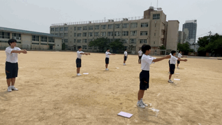 女子は体育館で、基礎体力の向上に取り組んでいます。男子は運動場で、ラジオ体操を行っています。今日の暑さ指数が高くなっているため、水分補給を充分行うように指導しています。
