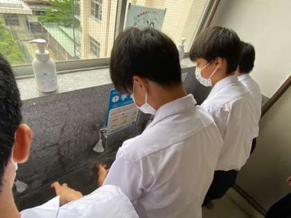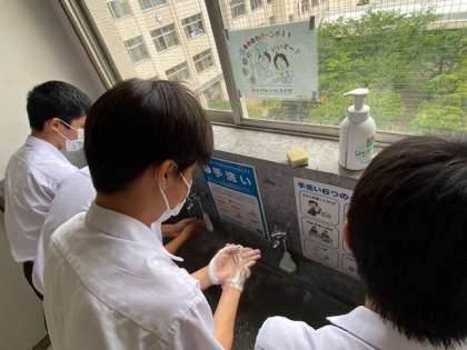 給食前に、しっかりと石けんで泡立てて手を洗っています。