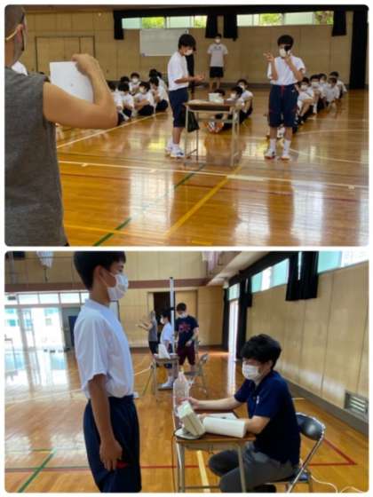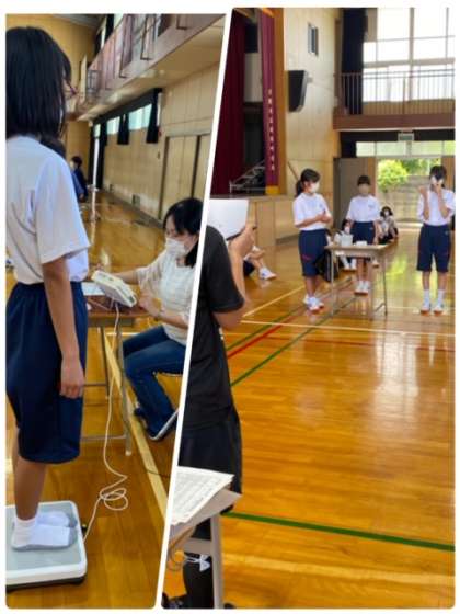 1年生の身体測定の様子です。体育館で広いスペースを取りながら、身長・体重・視力検査を行っています。測定する先生に「お願いします」「ありがとうございました」としっかり言うようにしています。