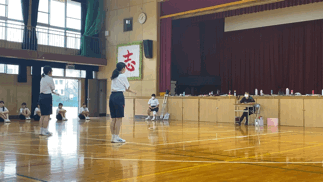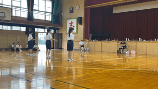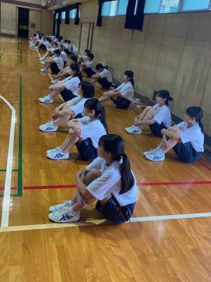 3年生の女子体育の授業も体育館で、ラジオ体操のテストを行っています。
