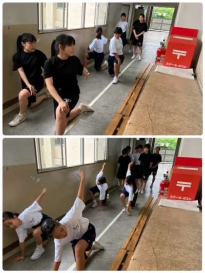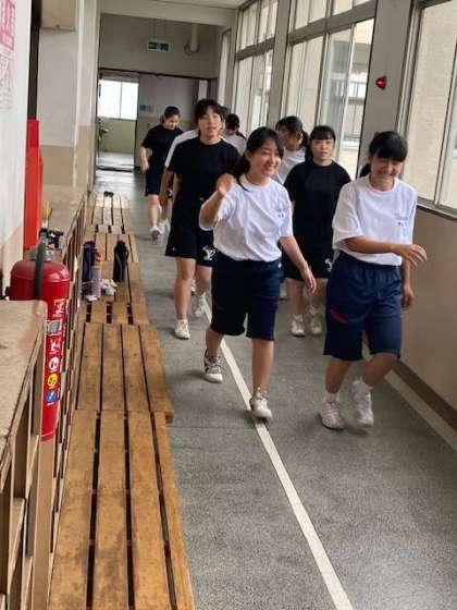 女子バスケットボール部は、あいにくの雨のため、廊下で基礎体力向上練習を行っています。