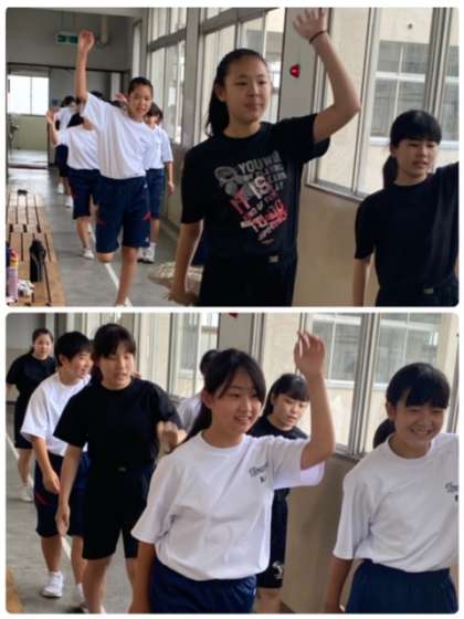 バスケットに有効な身体使いのアップ運動を、先輩たちに教えてもらいながら取り組んでいます。体育館での練習が待ち遠しいですね。