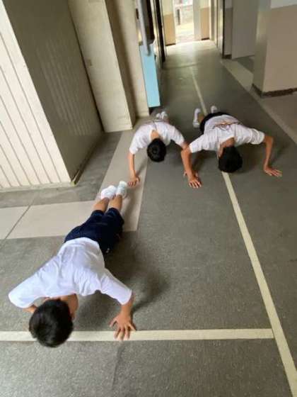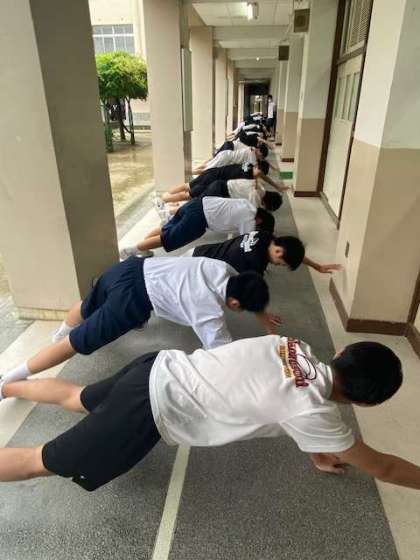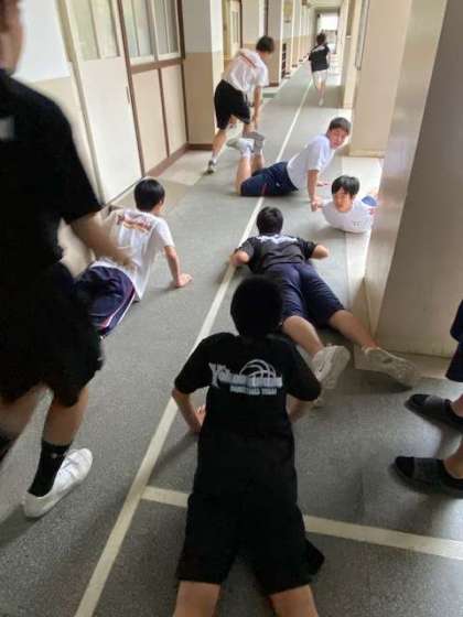 男子バスケットボール部も、端から端まで廊下を使うほどのたくさんの人数で練習を行っています。先輩たちと一緒に声をかけながら、必死についていこうとしている1年生の姿はとてもさわやかです。