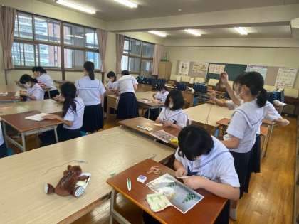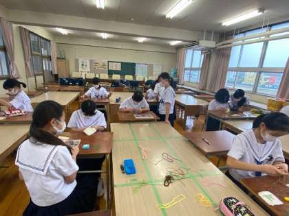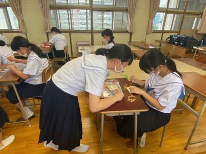 家庭科部では、1年生1人ずつに先輩がついて、手ほどきしながら活動を行っています。器用にミサンガを編み上げて、かわいくできあがったのを見て、とてもうれしそうです。
