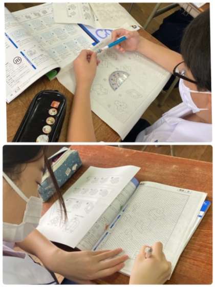 作図の学習として、方眼紙にさまざま形の立体図を書いています。2次元から3次元へと想像を膨らませることで、正しい空間認識ができるようです。