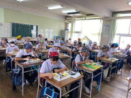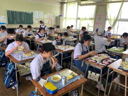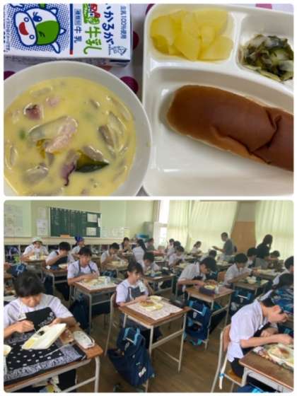 今日の給食メニューは、かぼちゃのクリームシチュー、ミックス海藻のサラダ、リンゴ(カット缶)、黒糖パン、牛乳です。