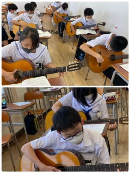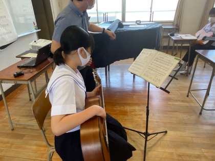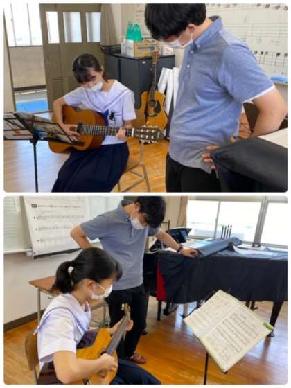 一人ずつギター奏法を確認しています。指の抑え方や弦のはじき方で音色が変わることを感じています。