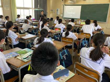 黒板にフラッシュカードを投影しています。1〜100までの数字を英単語でリズムよく発音していきます。幼い時にお風呂で数を数えたように、今度は英単語で数を数えて、ゆっくりお風呂に入りましょう!