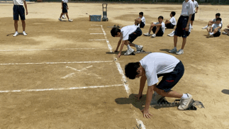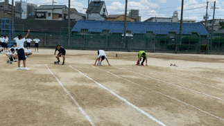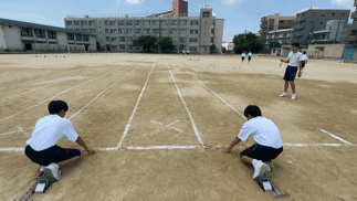 清々しい晴天のもと、元気いっぱいでダッシュする姿は、かっこいいです。先生たちも一緒に走っています。